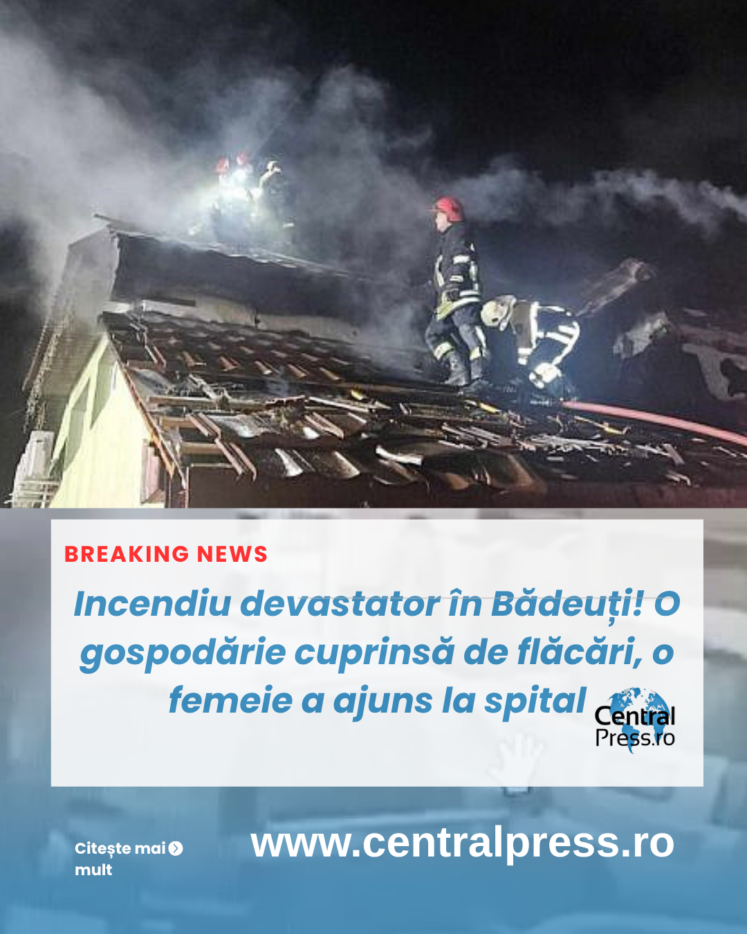 Un incendiu puternic a izbucnit în noaptea de 16 aprilie 2026, în localitatea Bădeuți, apelul la 112 fiind înregistrat la ora 00:38.