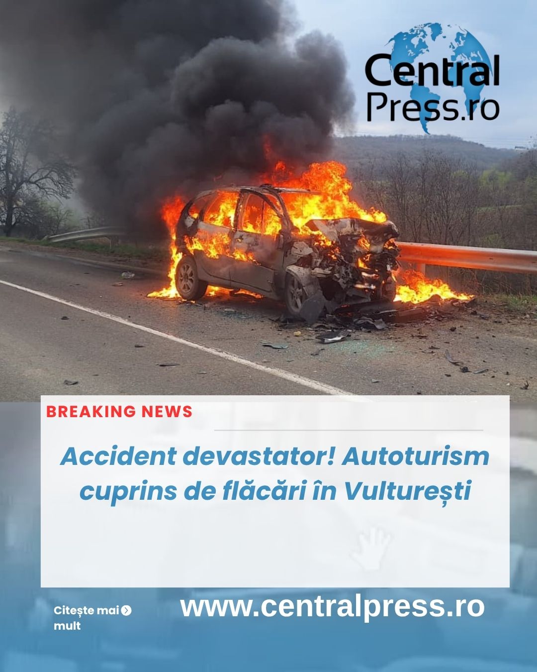 Un accident rutier grav, urmat de un incendiu, s-a produs vineri dimineață în localitatea Pleșești, comuna Vulturești. Incidentul a fost semnalat la 112 la ora 07:39.