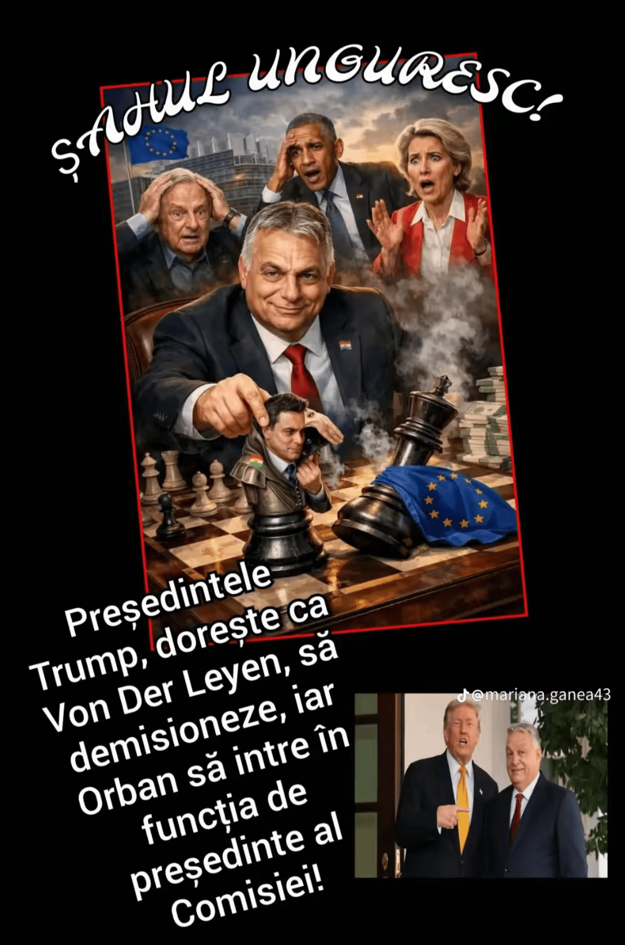 Un scenariu politic imaginar circulă în spațiul public internațional, în care fostul președinte al Statelor Unite, Donald Trump, ar încerca să influențeze radical structura de conducere a Uniunii Europene, propunând înlocuirea Ursulei von der Leyen cu premierul Ungariei, Viktor Orban. Situația nu are la bază evenimente reale, ci reprezintă un exercițiu ficțional de analiză politică.